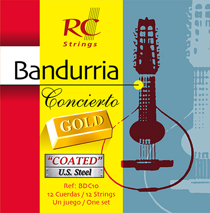 Juego de cuerdas de Banduria Royal Classics Concierto Gold. Juego de seis cuerdas dobles de acero liso en las dos primeras con recubrimiento coated antióxido, acero y hebras de nylon con entorchado dorado en la tercera y cuarta, y nylon con entorchado plateado en las dos últimas. El Juego de cuerdas de Bandurria Royal Classics Concierto garantizan una respuesta rápida y cómoda pulsación, siendo idóneas para los intérpretes de concierto y siendo uno de los juegos más equilibrados. Calibres: