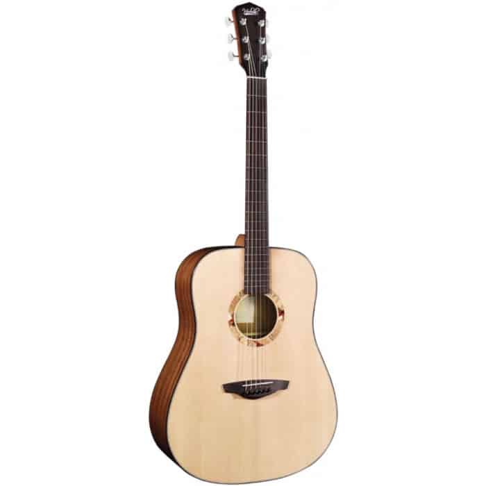 Guitarra acústica Veelah V2-D.  Construida con tapa de abeto macizo y roseta de maderas. Fondo y aros de Caoba. Mástil: Caoba con ancho de 43mm. Puente y diapasón: Pau Ferro. Tiro: 649 mm. La guitarra Veelah V2-D tiene acabado brillo que destaca la belleza natural de sus maderas y está encordada con el juego de Elixir Nanoweb. La Serie V2 de Veelah es la evolución de la V1 y cambia respecto a esta en unos acabados más destacados sin renunciar a la sencillez y facilidad de emisión, pero sin descuidar el más mínimo detalle, haciendo de ella un instrumento bello y llamativo, con gran presencia de graves gracias a la caoba. Al igual que todas las guitarras Veelah en términos de calidad de construcción y sonido es insuperable en su rango de precios. Incluye funda acolchada.