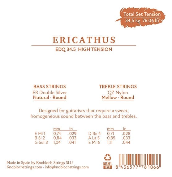 Juego de cuerdas de Guitarra Clásica Knobloch Erithacus Qz Nylon EDQ 34,5. Juego de seis cuerdas de tensión alta con primas de nylon QZ y bajos entorchados ER double silver, diseñado para músicos que buscan un sonido natural, redondo y estable, con una elasticidad extra en los agudos. La línea Erithacus ha sido creada para guitarristas que necesitan un sonido natural sin prescindir de la durabilidad y facilidad de ejecución, destacando por su gran versatilidad.