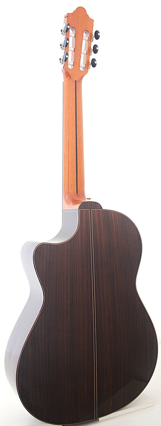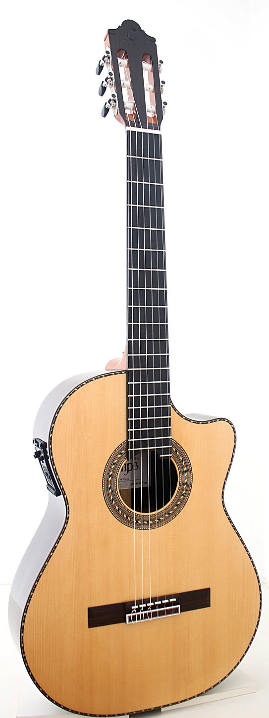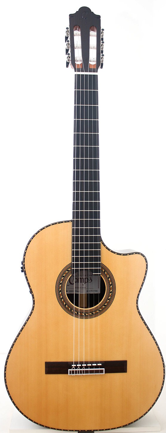Guitarra cutawey amplificada Camps 2000 Flex. Tapa: Abeto macizo. Aros y Fondo: Palisandro de la India Macizo. Mango: Cedro con varilla regulable. Diapasón: Ébano. Clavijeros: Dorados. Puente: Palisandro. Acabado: brillo. Amplificación: Fishman Flex BL. Escala: 650 mm. Ancho de Cejuela: 52 mm. Distancia entre 1ª y 6ª cuerda: 58 mm. Ancho de Zoquete: 93 mm. Ancho de Culata: 98 mm. La guitarra Camps 2000 Flex es una clásica con forma cutawey, destinada a intérpretes avanzados, de excelente comodidad, tono firme y claro en todos los registros y de perfecta construcción artesanal. Incorpora varilla regulable en el mástil que permite modificar la altura de las cuerdas y que el mástil sea más cómodo y ergonómico. Además incorpora un sistema de mini cejuelas independientes para cada cuerda que garantiza su perfecto balance y amplificación.