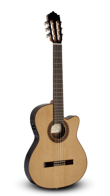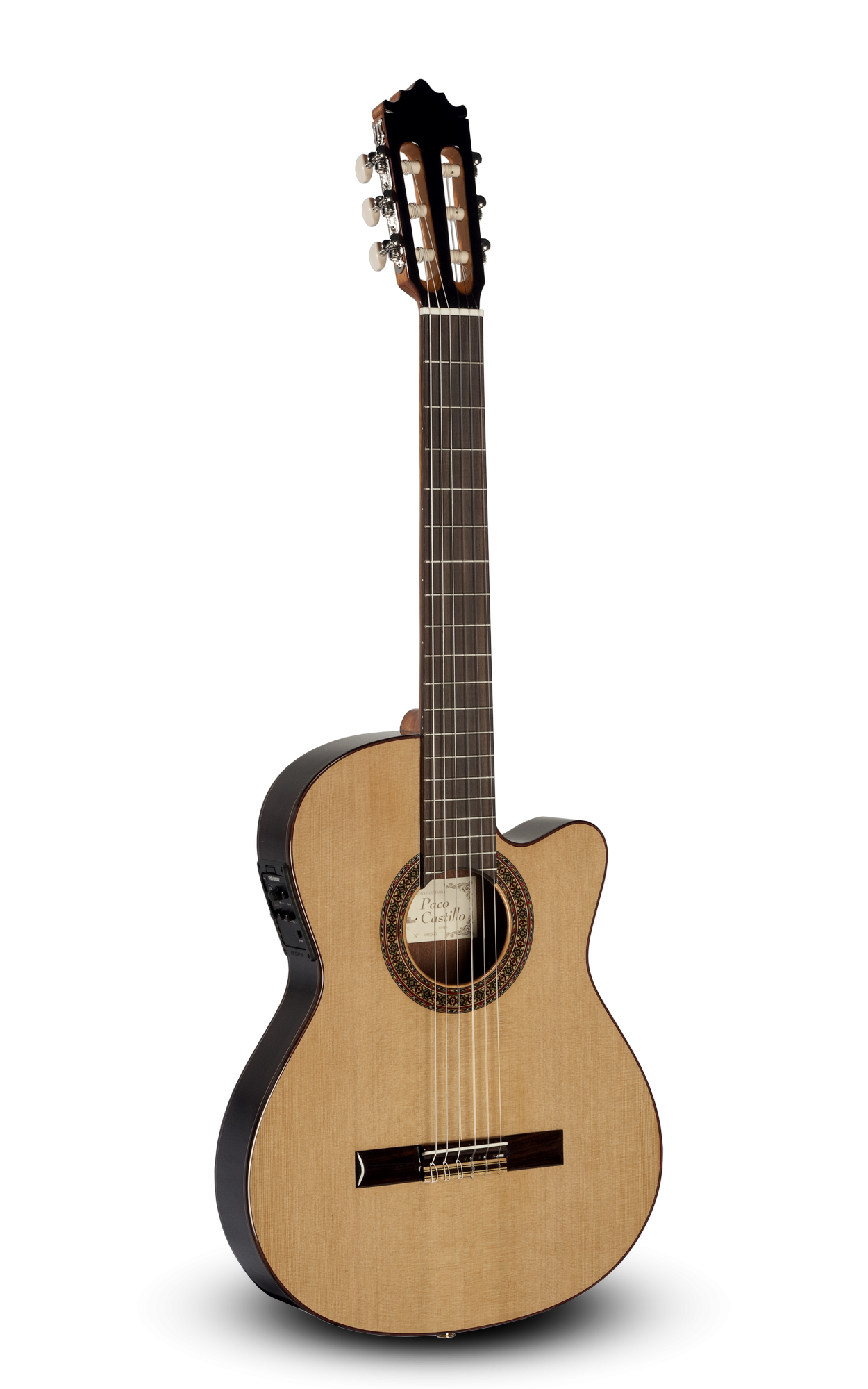 Guitarra cutaway PACO CASTILLO CUT 232TE. Tapa: Cedro Canadiense macizo. Aros y Fondo: Sapelli laminado. Mango: Caoba africano. Diapasón: Palosanto de india. Clavijeros: Niquelados. Acabado: Brillo. Previo: Fishman Clásica III. La guitarra Paco Castillo CUT 232TE es la guitarra cutaway de caja estrecha básica de la casa, pero a pesar de ello cuenta con un gran sonido y comodidad de interpretación.