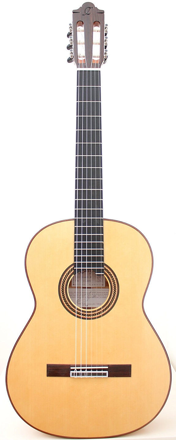 Guitarra Camps Primera A Ciprés. Tapa: Abeto macizo con golpeador transparente instalado. Aros y Fondo: Ciprés macizo de 1ª calidad. Mango: Cedro con alma de fibra de carbono. Diapasón: Ébano. Clavijeros: Dorados. Puente: Palisandro. Acabado: brillo. Escala: 650 mm. Ancho de Cejuela: 52 mm. Distancia entre 1ª y 6ª cuerda: 58 mm. Ancho de Zoquete: 85 mm. Ancho de Culata: 90 mm. La guitarra Camps Primera Negra de construcción artesanal en colaboración con el músico Manuel Granados (incluye certificado de calidad), es un instrumento flamenco profesional de maderas macizas de primera calidad con una sonoridad llena de matices.