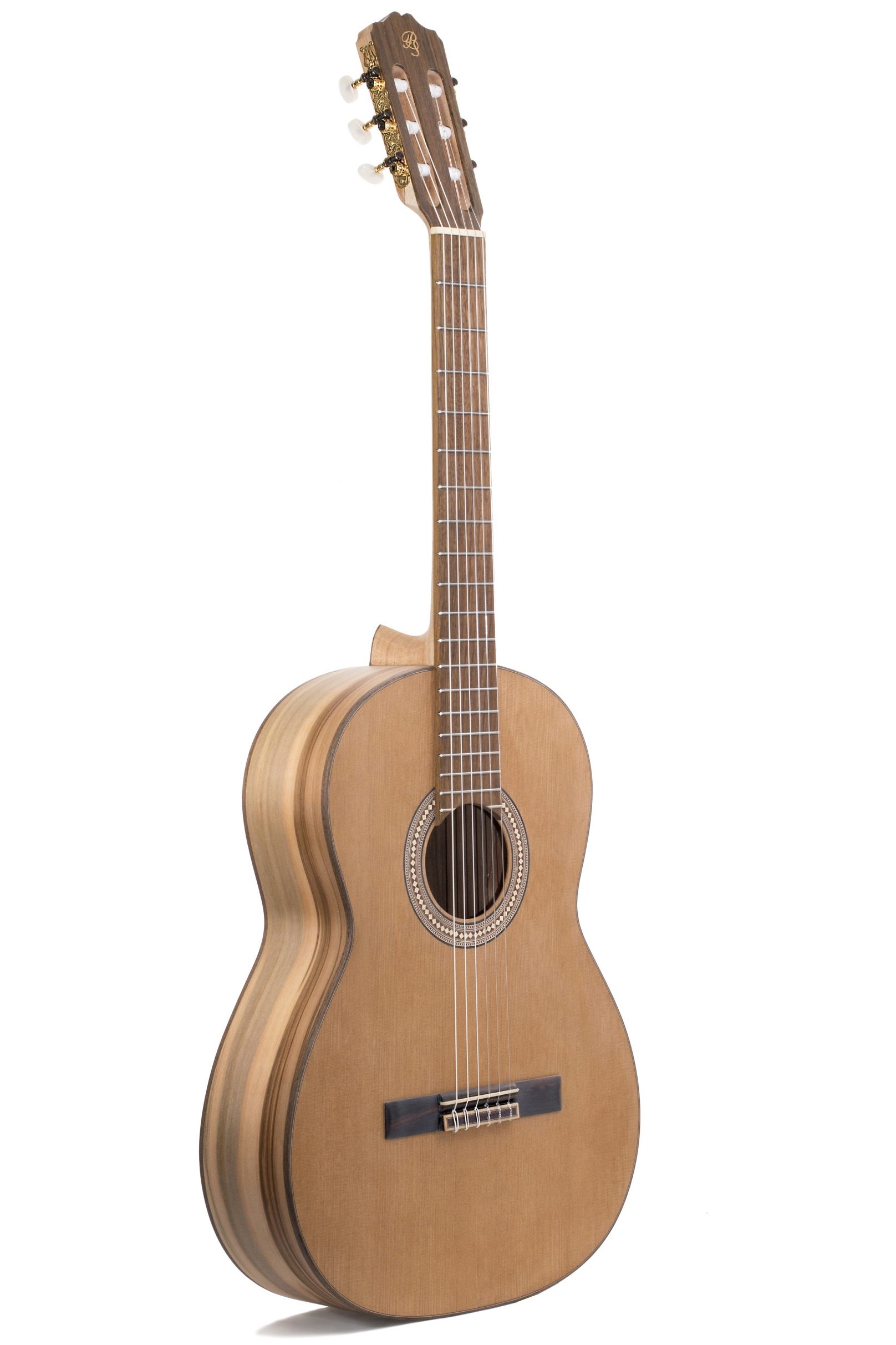 Guitarra Prudencio Saez 2-S. Tapa: Cedro macizo. Aros y Fondo: Redgum laminado. Mango: Samanguila. Diapasón: Palosanto. Clavijeros: Lira dorado. Puente: Palosanto. Escala: 650mm. Ancho cejuela: 52mm. Ancho zoquete: 96mm. Ancho culata: 102mm. La guitarra Prudencio Saez 2-S, antiguo modelo 160, es una guitarra de iniciación construida siguiendo los métodos artesanales con una espectacular y vistosa madera de redgum.
