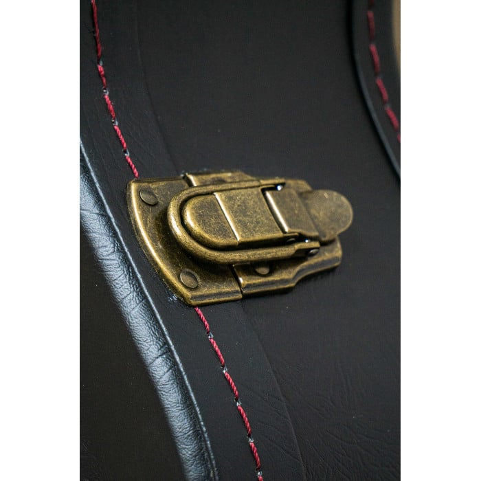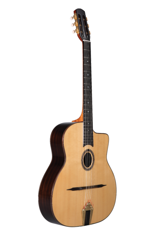 Guitarra Altamira Gipsy M01. Tapa: Abeto macizo. Aros y Fondo: Palisandro de la India laminado. Mango: Caoba. Diapasón: Ébano. Clavijeros: Dorados. Puente: Palosanto. Acabado: brillo. Escala: 670 mm. Encordadas con Savarez Argentine. La Guitarra Altamira Gipsy M01 es una guitarra acústica de estilo Semer-Maccaferri. De cuerpo grande y boca redonda, cuenta con un puente móvil tipo mandolina que permite una mayor vibración de la tapa. La parte superior está suavemente abovedada. Acabado brillo. Incluye estuche rígido.