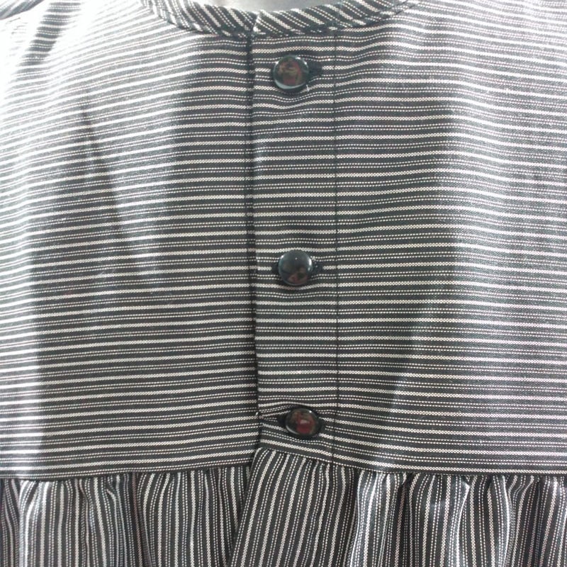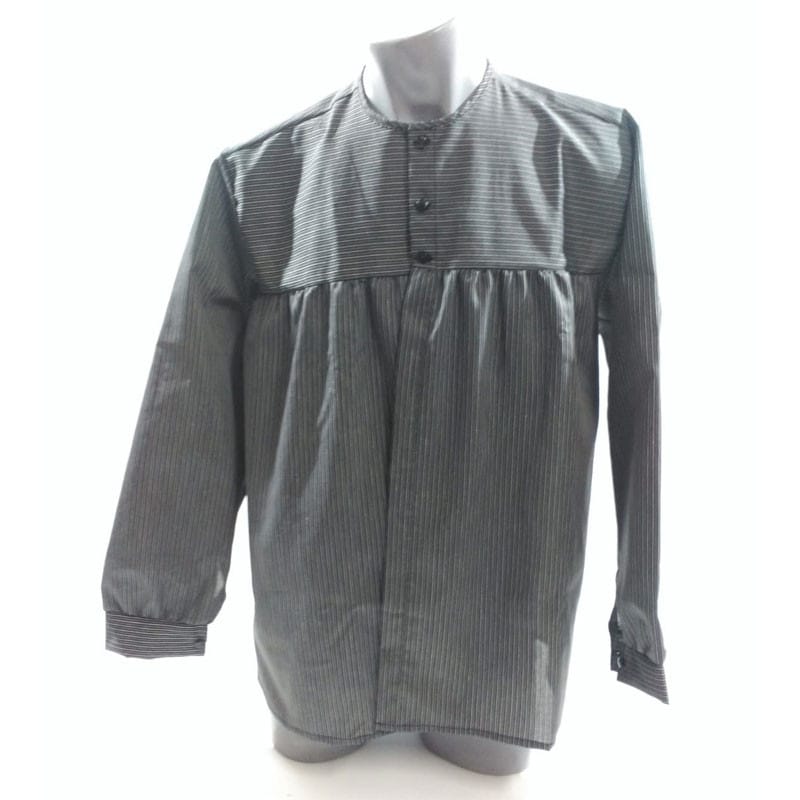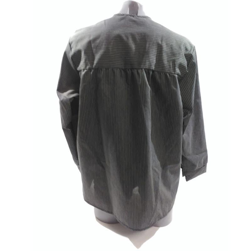 Blusón tradicional con tres botones de bola en la parte delantera del canesú y amplio vuelo plisado en la inferior. Disponible en varias tallas y confeccionado con tejido de doble raya negra. Cuenta con bolsillo pequeño en interior a la altura del pecho.