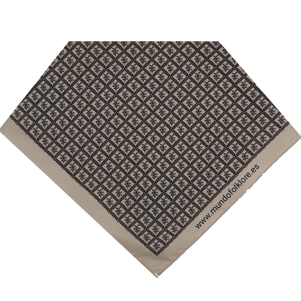 Pañuelo Estampado PV37 fabricado en 100% viscosa de medidas 100×100 cm. El pañuelo Estampado PV37 con fondo beige y elementos naturales y geométricos de color negro que resulta ideal para la indumentaria tradicional del hombre o como pañoleta de mujer. De tacto suave y elegante presencia.