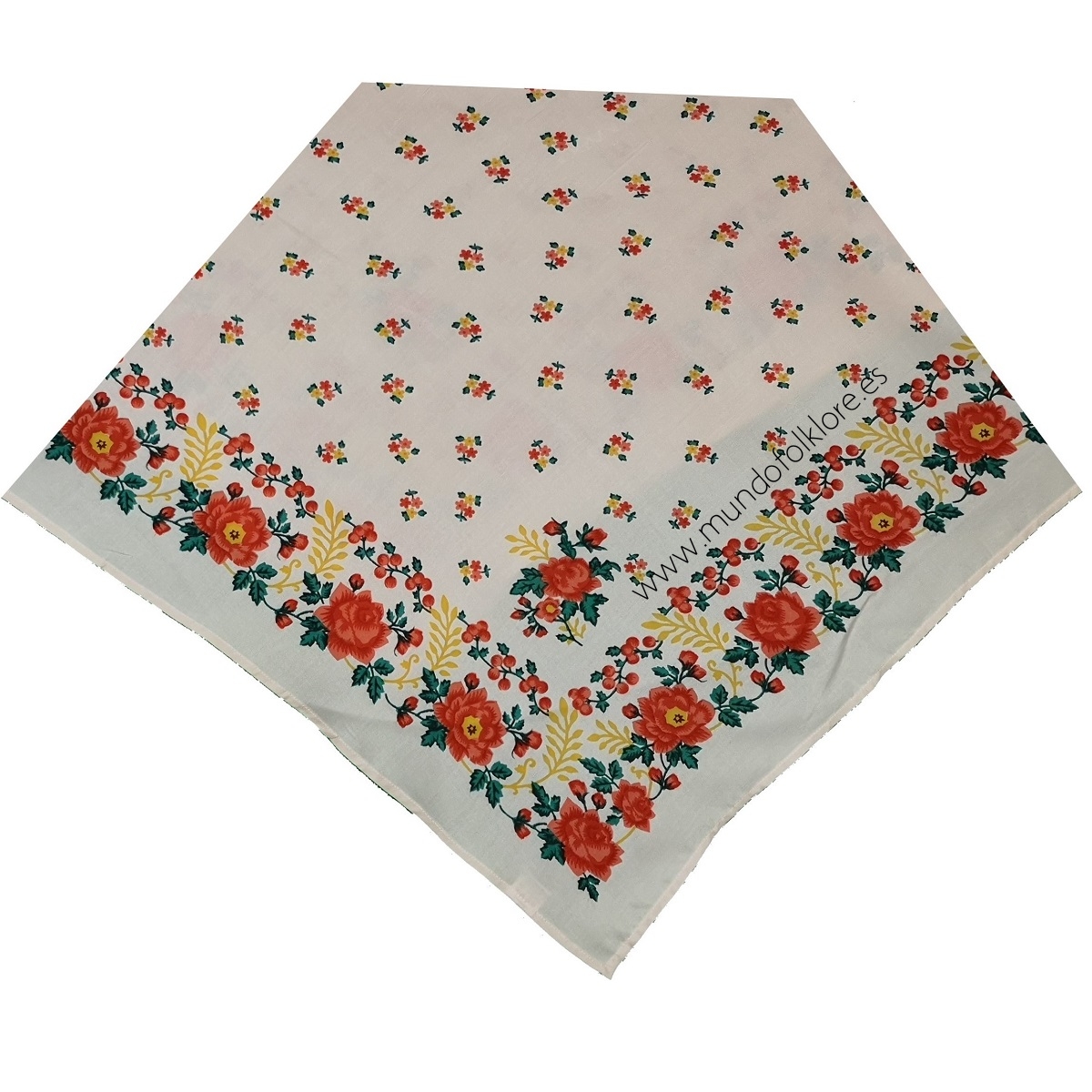 Pañuelo Galicia 100% fabricado en viscosa de máxima calidad con estampación floral tradicional. Pañuelo utilizado en prácticamente en la indumentaria tradicional de cada rincón de la península. Se trata de un modelo muy similar al típico pañuelo portugués. El pañuelo Galicia mide 90 cm de lado y está disponible con el fondo en varios colores.