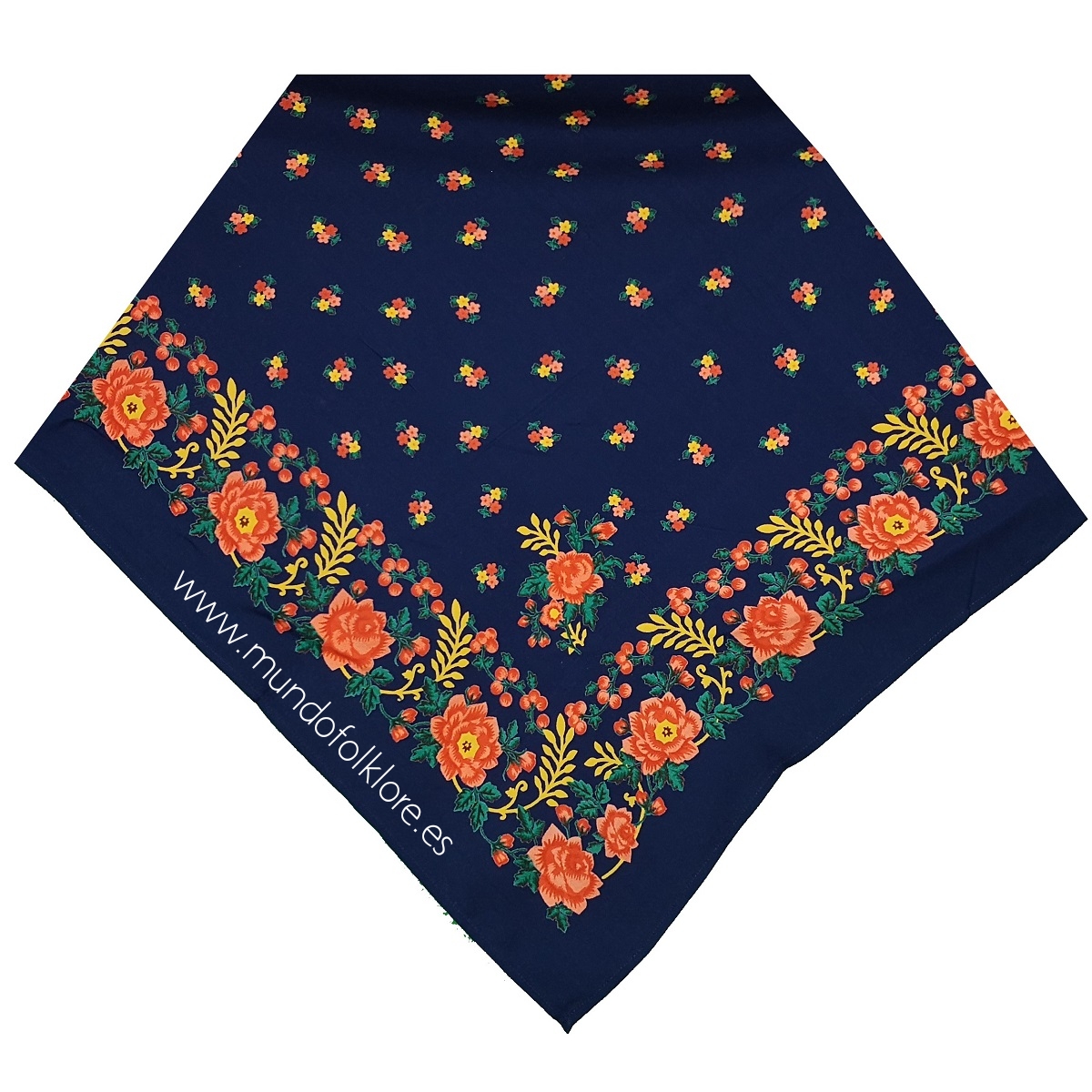 Pañuelo Galicia 100% fabricado en viscosa de máxima calidad con estampación floral tradicional. Pañuelo utilizado en prácticamente en la indumentaria tradicional de cada rincón de la península. Se trata de un modelo muy similar al típico pañuelo portugués. El pañuelo Galicia mide 90 cm de lado y está disponible con el fondo en varios colores.