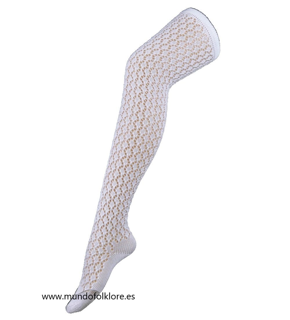 Medias caladas con dibujo tipo margarita en formato largo (cubre por encima de la rodilla y hasta el muslo y de color blanco, fabricadas con algodón perlé egipcio 100% de alta calidad. Medias elegantes con calado tradicional. Tallas disponibles 34 a 45. Consultar para otras tallas o características. (PA29)