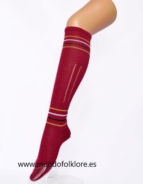 Medias Vertical Fina, de formato corto (cubre hasta la altura de la rodilla) fabricadas con algodón perlé 100% de alta calidad. Medias disponibles con fondo en distintos colores: beige, oro, verde y granate con finas rayas horizontales en tobillo y rodilla. Destacan por su gran comodidad. Copia de modelo original de la indumentaria tradicional. Tallas disponibles 34 a 45. Consultar para otras tallas. (PCR83)