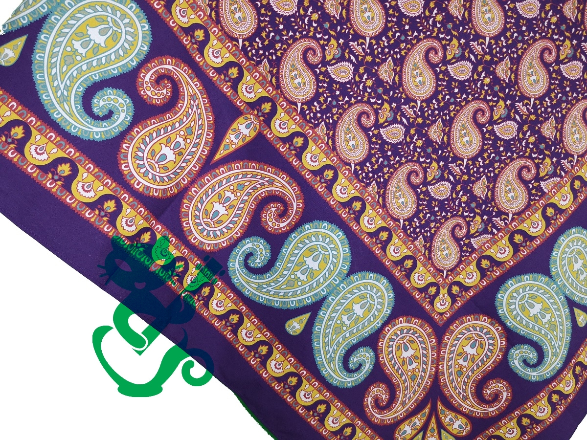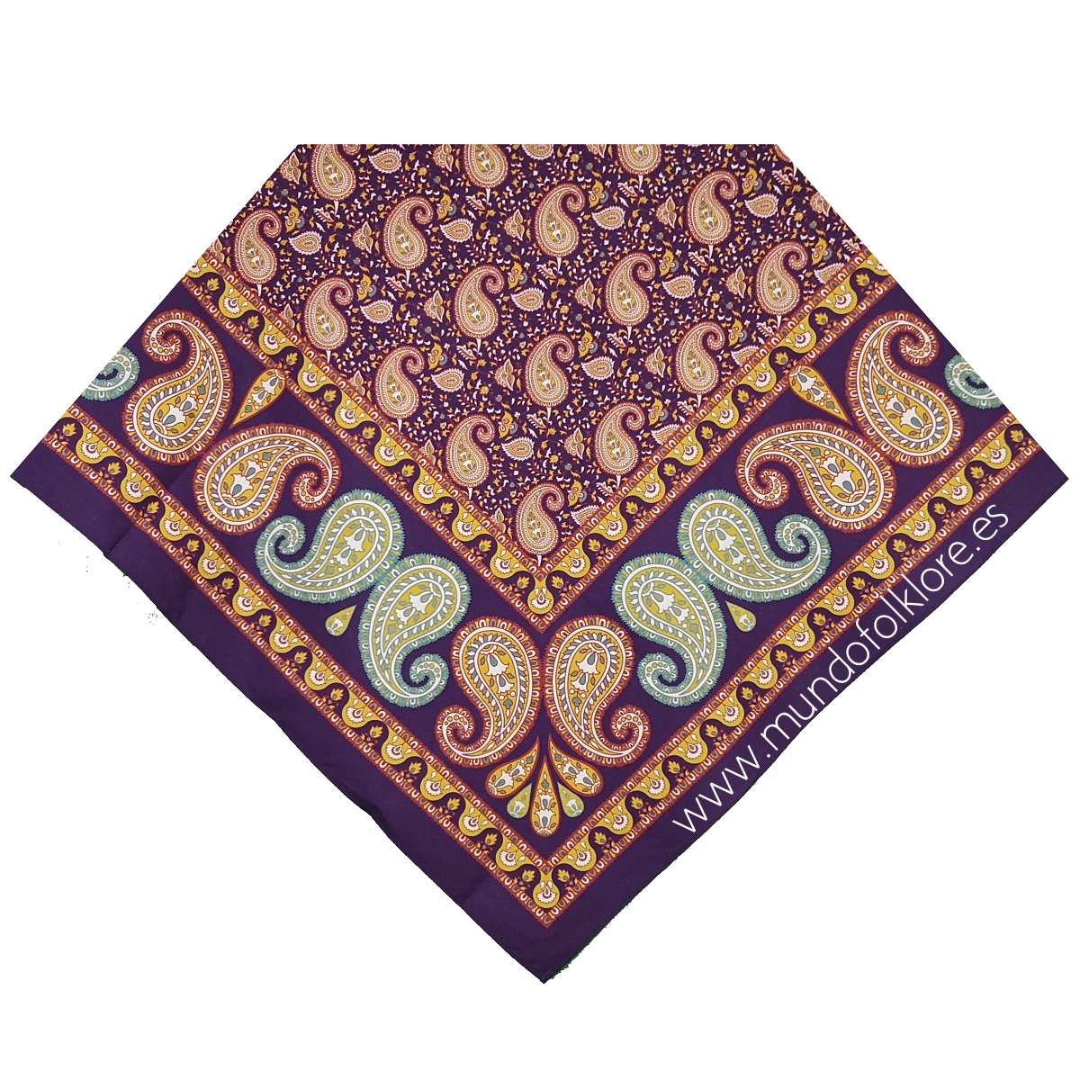 Pañuelo Indiana 10 estampado sobre algodón 100% con cenefa de motivos de cachemires sobre fondo morado. Reproducción de pañuelo antiguo, medida 120×120 cm. Ideal para indumentaria tradicional s. XIX