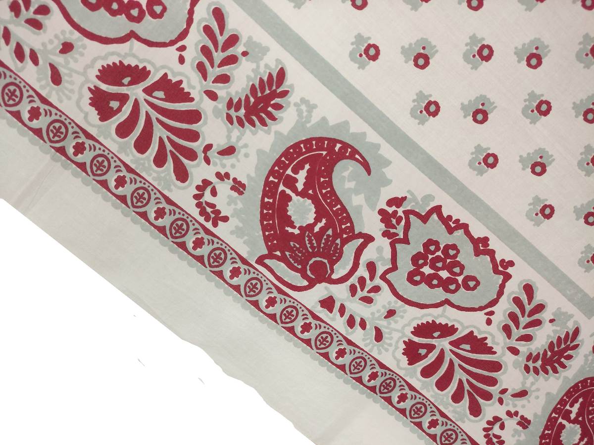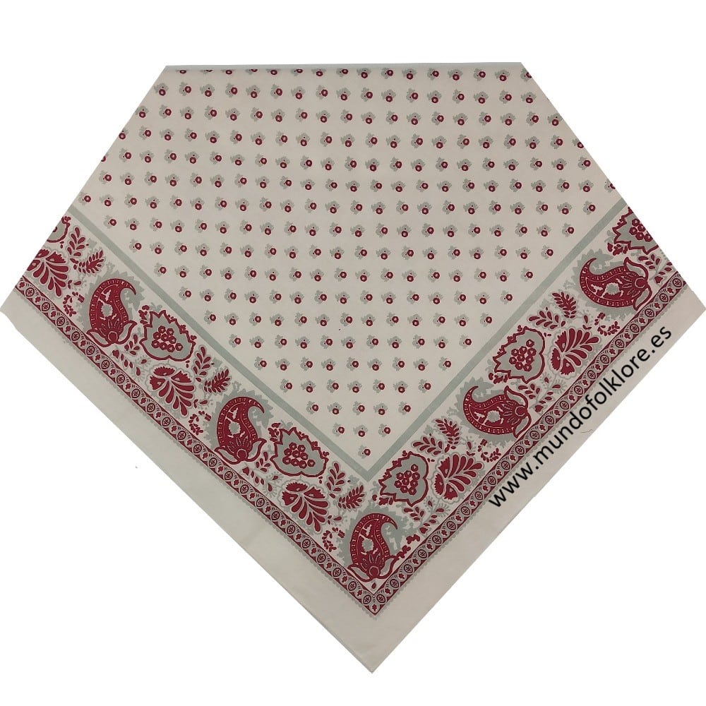Pañuelo Indiana 6 estampado sobre algodón 100% con cenefa de motivos florales sobre fondo beig. Reproducción de pañuelo antiguo, medida 120×120 cm. Ideal para indumentaria tradicional s. XIX