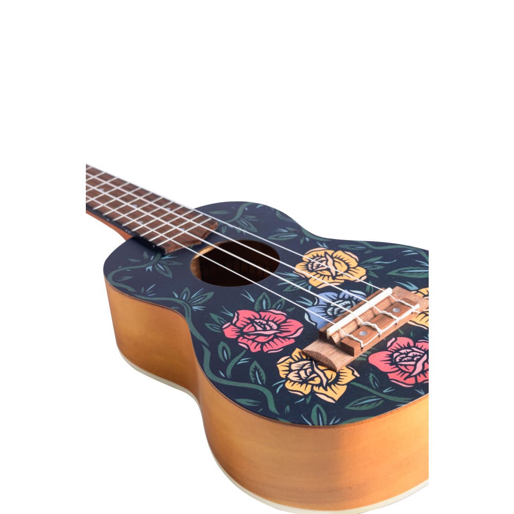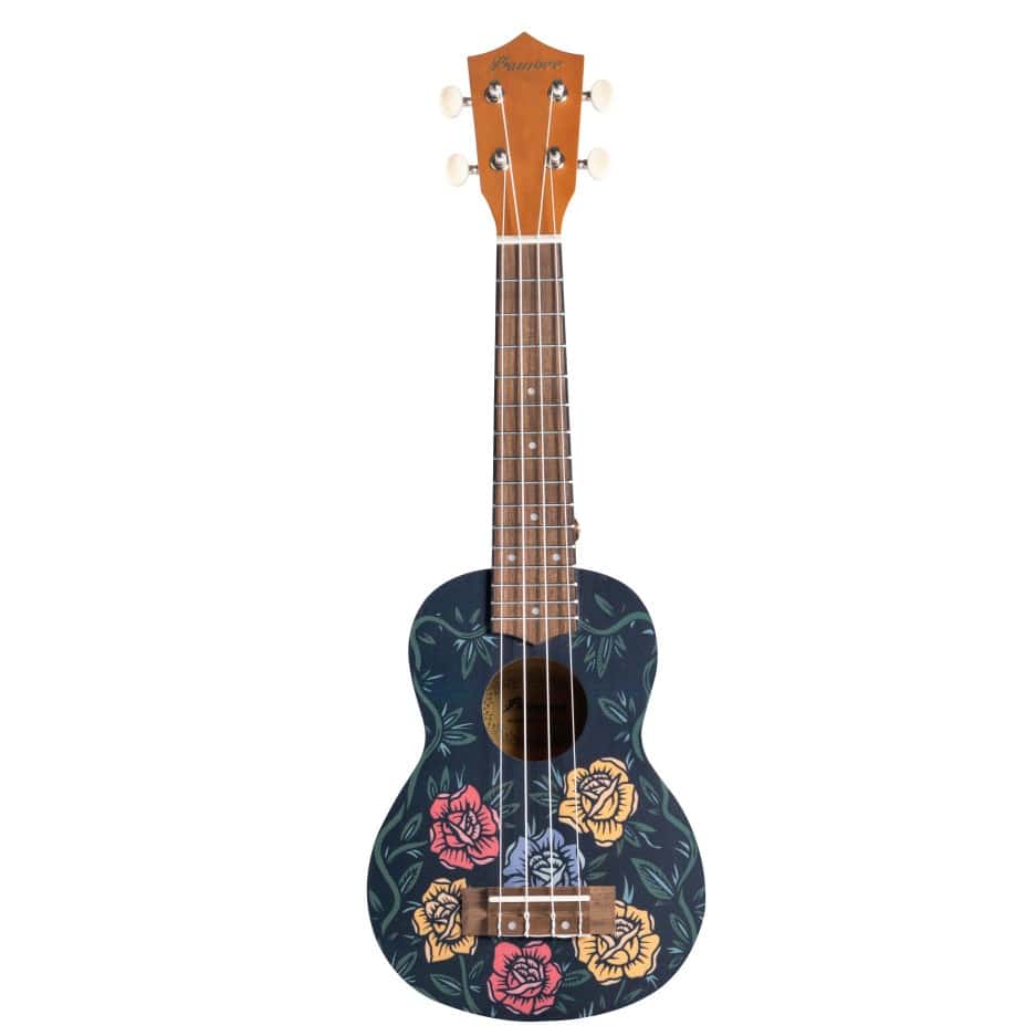 Ukelele Soprano Bamboo Aurora. Tapa: Tilo. Aros y fondo: Tilo. Mango: Tilo. Puente: Nogal. Clavijeros: abiertas cromadas. Acabado satinado con diseño colorido. El Ukelele Bamboo Aurora es un ukelele de tamaño soprano perteneciente a la New Collection de Bamboo que convina un aspecto muy llamativo debido a colorido diseño de su tapa y una más que aceptable calidad sonora. Incluye funda de transporte.