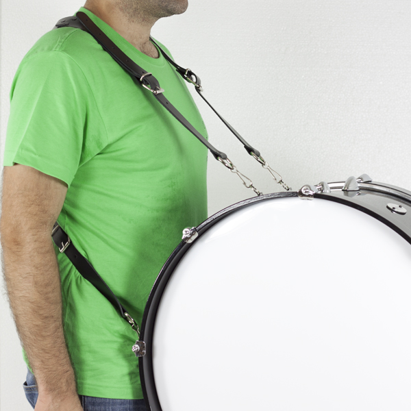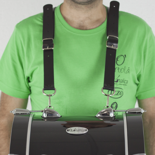Correa bombo cruzada Ortolá fabricada en piel. Ancho de correas de 35 mm Longitud de largo mínimo 100cm y máximo 143cm. Cuenta con 4 mosquetones metálicos.