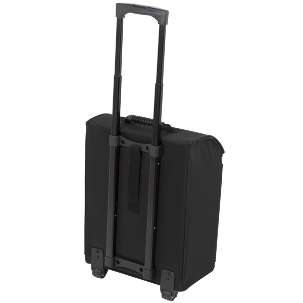 Estuche fabricado en poliéster plastificado con interior de velour negro y acolchado reforzado con madera. El carro de baquetas cuenta con diferetes compartimentos acolchados. Su transporte es comodisimo debido a que se trata una maleta con sistema trolley con ruedas. Medidas: 48×36,5x22cm. Peso:3,50Kg.
