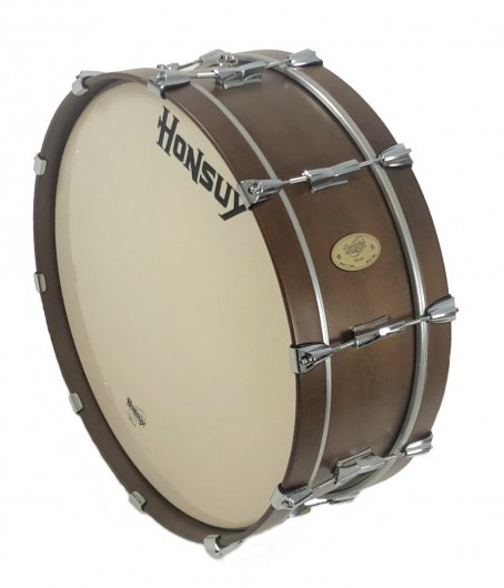 Bombo Banda Honsuy de 24 cm de ancho (9,5″) fabricado con casco (4 láminas) y aros de madera contrachapada (de 4 cm) y acabado tintado, sistema de tensión de doble bellota independiente para cada parche de fundición Honsuy cromadas (10 bellotas dobles). Parches batidores Honsuy. 5 diámetros disponibles.